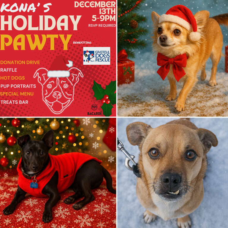 We are so grateful to Kona’s, who are hosting a Holiday Paw-ty donation drive this Saturday December 13, between 5-9pm.